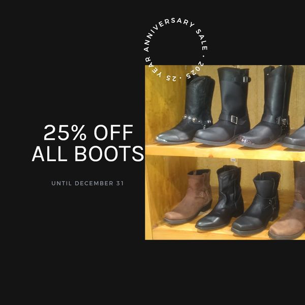 Tannehill Leather is celebrating 25 years in business thanks to our loyal customers! We are currently offering the lowest prices ever on our leather boots. Visit our store for weekly SPECIALS on leather apparel and boots. Have a Happy New Year from your friends at Tannehill Leather!